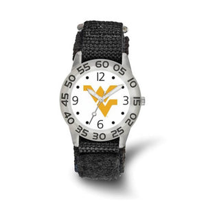 Category: 2 Year Warranty 3 ATM (Tested) Water Resistant Alloy Analog Display Black Colored Band Boys Watches Collegiate Girls Watches Hook and Loop Closure Kids Watches Mineral Crystal NCAA NCAA - West Virginia U. Not Engravable Nylon Band Quartz (Battery Operated) Round Face Stationary Bezel White Face Wrist Watch