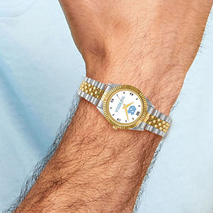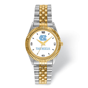It is time to celebrate your favorite school, University of North Carolina! This men's University of North Carolina pro two-tone watch features a quartz (battery operated) movement and has a white dial color. The case is 35 x 35 mm in size and includes a 2 year warranty.