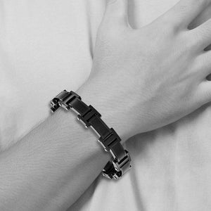 Simple and classic, this black-plated stainless-steel bracelet features a brushed and polished finish. It is approximately 12.5mm (1/2 inch) in width by 8.25 inches in length, which includes the fold over clasp.