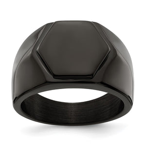 • Traditional signet rings are stylish and timeless! This mens black-plated stainless-steel ring features a polished (outside) and brushed (inside) finish, a raised hexagon top and a tapered fit. It is approximately 12mm in width across the top and of course, suitable for engraving.