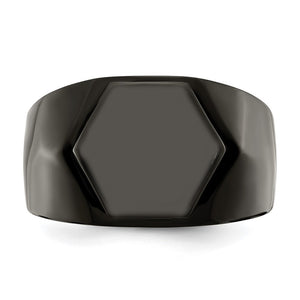 Traditional signet rings are stylish and timeless! This mens black-plated stainless-steel ring features a polished (outside) and brushed (inside) finish, a raised hexagon top and a tapered fit. It is approximately 12mm in width across the top and of course, suitable for engraving.