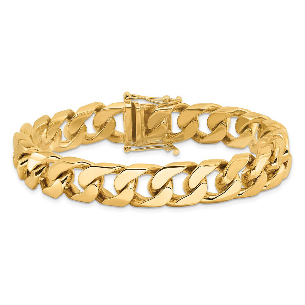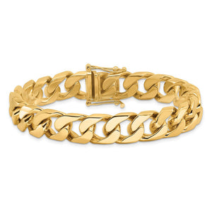 This hand polished, solid link, flat beveled curb chain bracelet is crafted from 14k yellow gold. Measures 8 inches in length, 12mm in width and closes with a heavy duty box closure.