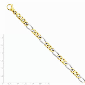 This beautiful figaro style solid link bracelet is crafted from Two Tone 14k yellow and white gold. It is 8 inches in length, 7.85mm in width and closes with a fancy lobster clasp.