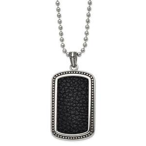 Simple and classic, this polished and antiqued stainless-steel necklace features a black textured leather inlay dog tag that is approximately 25mm (1 inch) in width by 51mm (2 inches) in length, which includes the bail. It hangs on a 2.5mm width by 22-inch-long polished bead chain that closes with a fancy lobster clasp.