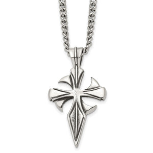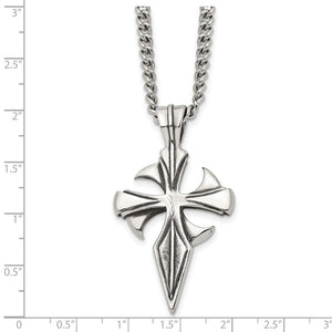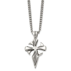 Daring, mesmerizing, eclectic style! This antiqued and polished stainless steel necklace features a dagger cross pendant that is approximately 30mm (1 3/16 inch) in width by 51mm (2 inches) in length, which includes the bail. It hangs on a 3mm width by 22-inch long curb chain finished with a fancy lobster clasp.