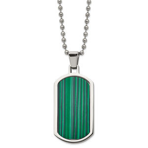 Simple and classic, this polished stainless-steel necklace features a malachite inlay dog tag that is approximately 20mm (3/4 inch) in width by 36mm (1 3/8 inch) in length, bail not included. It hangs on a 2.5mm width by 22-inch-long polished bead chain that closes with a fancy lobster clasp. The color range varies on all genuine gemstones so please allow for slight variations in shades. The color on your screen may also not reflect actual gemstone color due to variations in monitors and browsers. Gemstone treatment: unknown.