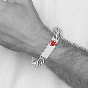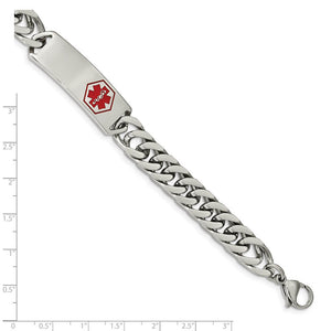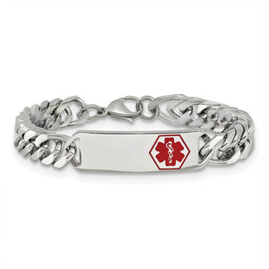 Medical ID's save lives. This men's 8.5-inch bracelet fashioned from stainless steel and enamel features a 13mm (1/2 inch) by 46mm (1 3/4 inch) centerplate with a red enamel medical alert emblem. The polished rambo or double curb chain is roughly 10mm (3/8 inch) in width and closes with a fancy lobster clasp. Suitable for engraving on the front and back.