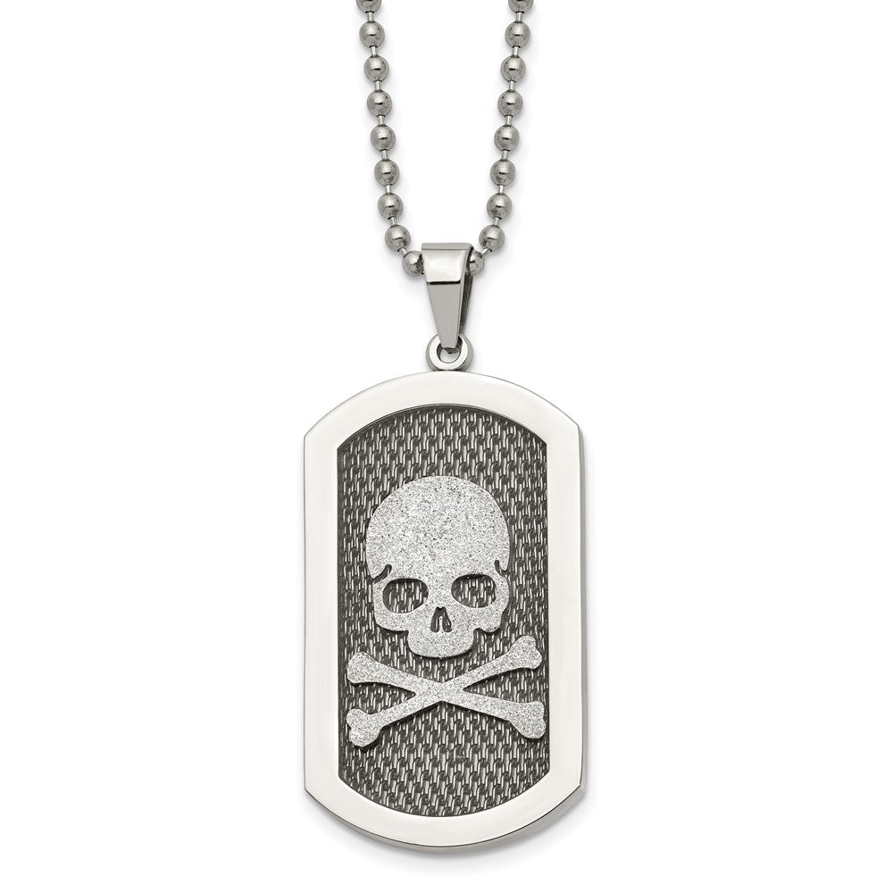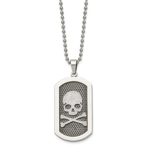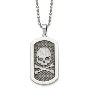 Daring, mesmerizing, eclectic style! This brushed and polished stainless steel necklace features a laser-cut skull and bones dog tag pendant that is approximately 26mm (1 inch) in width by 57mm (2 1/4 inches) in length, which includes the bail. It hangs on a 2.5mm width, 24-inch long bead chain that closes with a fancy lobster clasp. Suitable for engraving on the back.