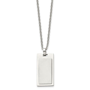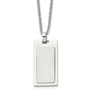 Simple and classic, this brushed and polished stainless-steel necklace features a small rectangular dog tag pendant that is approximately 17mm (5/8 inch) in width by 33mm (1 1/4 inch) in length, bail not included. It hangs on a 2mm width by 22-inch-long polished cable chain that closes with a fancy lobster clasp. Suitable for engraving.