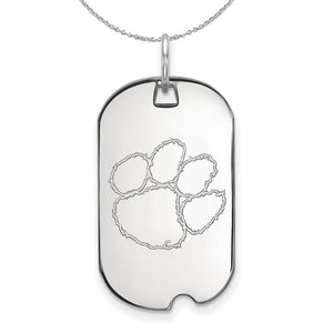 If you are a fan of Clemson University and the Tigers then you need to show your school spirit with this Clemson University necklace. We are a certified college jewelry retailer and this authentic item is officially licensed. It is crafted from Sterling Silver and crafted by LogoArt in the USA. It is approximately 18mm (11/16 inch) in width by 30mm (1 3/16 inch) in length. The total length with the jump ring or bail is 36mm (1 3/8 inch). Includes a 20 Inch, 1.25mm cable chain.