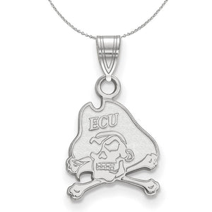 • If you are a fan of East Carolina University and the Pirates then you need to show your school spirit with this East Carolina University pendant. We are a certified college jewelry retailer and this authentic item is officially licensed. It is crafted from Sterling Silver and crafted by LogoArt in the U.S.A. Includes a 1.25mm, 18 inch sterling silver cable chain.