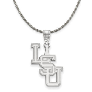 • If you are a fan of Louisiana State University and the Fightin Tigers then you need to show your school spirit with this Louisiana State University pendant. We are a certified college jewelry retailer and this authentic item is officially licensed. It is crafted from Sterling Silver and crafted by LogoArt in the USA. Includes a flexible and strong diamond cut rope chain. This stunning chain is 2.25mm in width, 22 inches in length and features a sturdy lobster claw clasp. The chain is crafted in Italy.