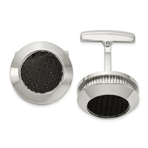 Classic elegance, perfect for every occasion! These polished round stainless-steel cuff links feature a black carbon fiber inlay and textured edge design with a whale back toggle clasp. They are approximately 19mm (3/4 inch) in diameter. Not suitable for engraving.