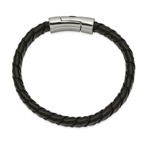 Change up your look with this stainless steel and black leather bracelet featuring an antiqued Maltese cross design. The braided strap is approximately 11mm (7/16 inch) in width. The magnetic clasp width is 16mm (5/8 inch) and the length is by 8.5 inches.