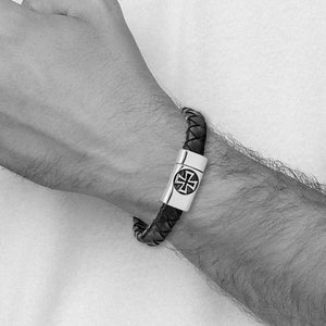 Stainless Steel Black Leather Braided Maltese Cross Bracelet, 8.5 Inch