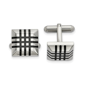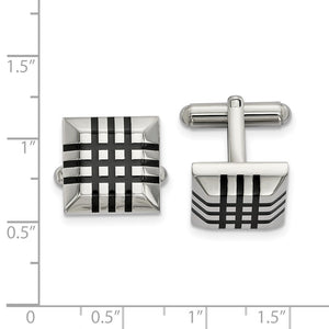 Classic elegance, perfect for every occasion! These polished square stainless-steel cuff links feature a black rubber striped and domed design with a bullet back toggle clasp. They are approximately 15mm (9/16 inch) in width by 15mm (9/16 inch) in length. Not suitable for engraving.