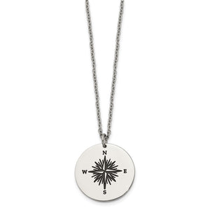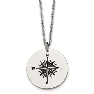 Simple and classic, this polished stainless-steel necklace features an enameled compass disc pendant engraved on the back with 'NOT ALL WHO WONDER ARE LOST'. The disc is approximately 25mm (1 inch) in width and hangs on a 1.95mm width by 22-inch-long polished cable chain that closes with a fancy lobster clasp.