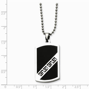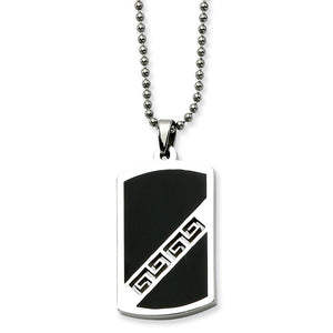 This stainless steel dog tag features black enamel and a cut out ancient Greek symbol known to represent the search for one's Path. It measures approximately 7/8 inch x 1 1/4 inches and comes with a 20 inch ball chain finished with a hidden catch.