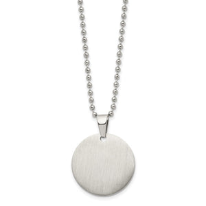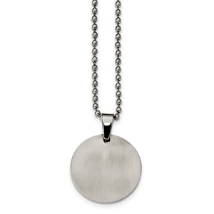 Simple and classic, this reversible stainless-steel necklace features a 4mm thick by 28mm (1 1/8 inch) width disc pendant that is polished on 1 side, brushed on the opposite side and suitable for engraving. It includes a 2.3mm width by 24-inch-long polished bead chain that closes with a fancy lobster clasp.