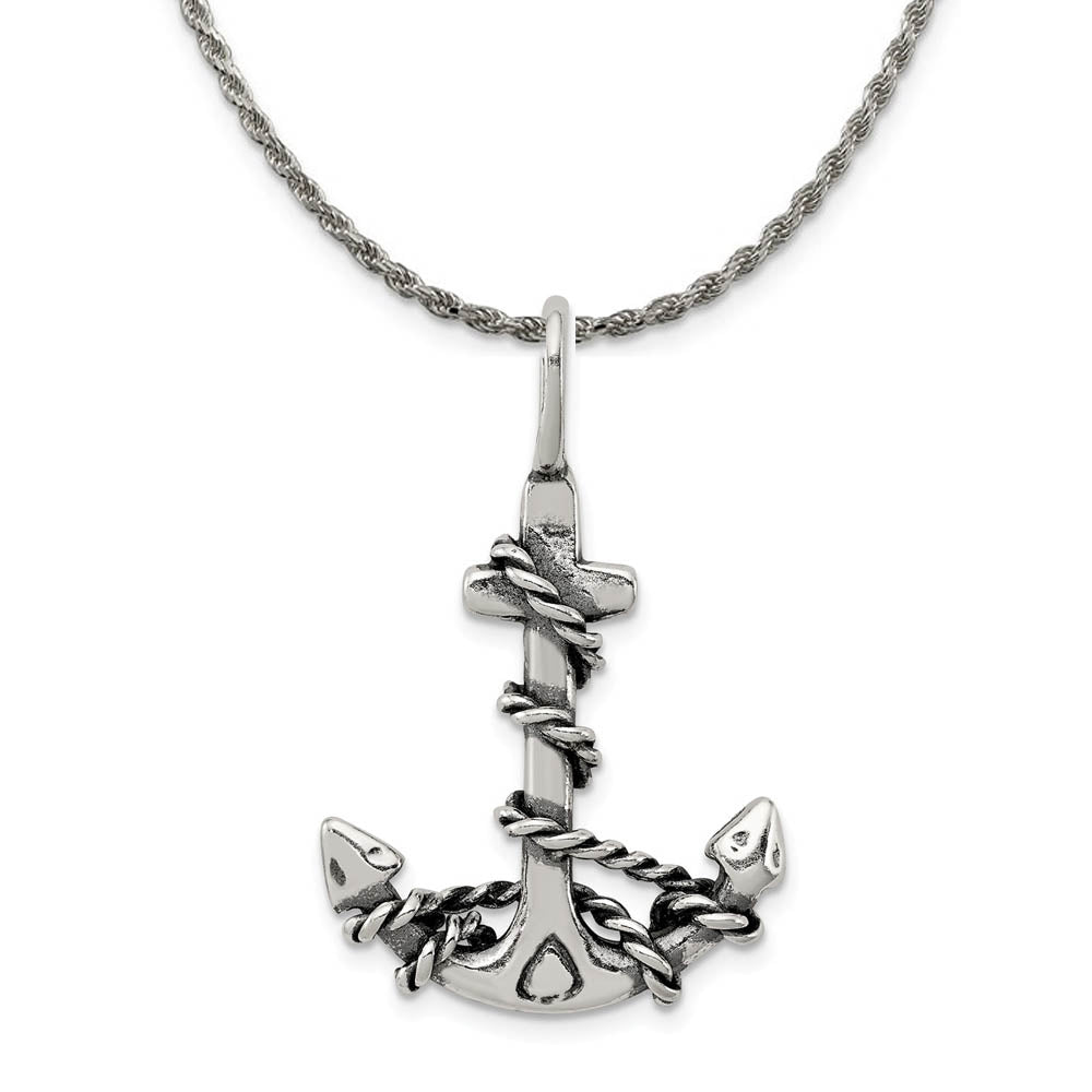 • A classic nautical symbol, an anchor with an entwined rope created from antiqued sterling silver. It features a solid, three-dimensional design and is approximately 22mm (7/8 Inch) in width by 32mm (1 1/4 Inch) in length. Includes a flexible and strong diamond cut rope chain. This stunning chain is 2.25mm in width, 22 inches in length and features a sturdy lobster claw clasp. The chain is crafted in Italy.