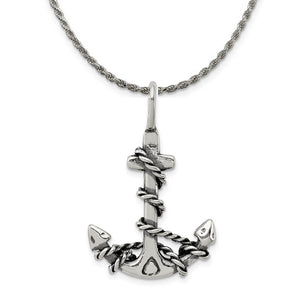 • A classic nautical symbol, an anchor with an entwined rope created from antiqued sterling silver. It features a solid, three-dimensional design and is approximately 22mm (7/8 Inch) in width by 32mm (1 1/4 Inch) in length. Includes a flexible and strong diamond cut rope chain. This stunning chain is 2.25mm in width, 26 inches in length and features a sturdy lobster claw clasp. The chain is crafted in Italy.