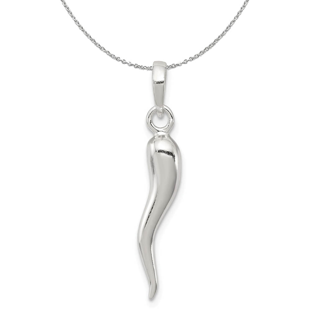 This lucky talisman also known as the cornicello which in Italian means little horn is worn as protection against the evil eye. It is fashioned from polished sterling silver and measures approximately 5mm (3/16 inch) in width by 30mm (1 1/8 Inch) in length, which includes the tapered bail. Includes a 1.25mm, 20 inch sterling silver cable chain.