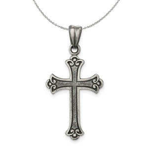 Faith inspired fashion, this fleur-de-lis cross features a textured flat back design created from antiqued sterling silver. It is approximately 17mm (5/8 Inch) in width by 33mm (1 1/4 Inch) in length, which includes the tapered bail. Includes a 1.25mm, 24 inch sterling silver cable chain.