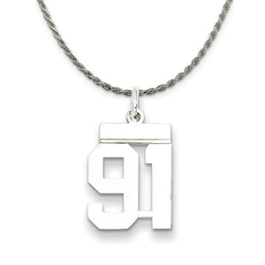 Celebrate your favorite sports player, lucky number or milestone date in your life with a prominent rhodium-plated sterling silver charm. Each polished number is approximately 18mm (11/16 inch) in length, which is finished with a 2mm top bar and a classic jump ring. Includes a flexible and strong diamond cut rope chain. This stunning chain is 2.25mm in width, 20 inches in length and features a sturdy lobster claw clasp. The chain is crafted in Italy.