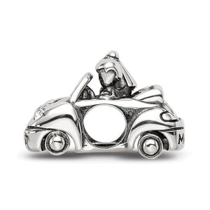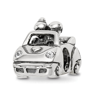 Add a chapter to your bead collection with theme charms designed to reveal your personal story and celebrate special events. This bride and groom car charm made from polished and antiqued sterling silver features crystal headlights and Just Married on the back. It is approximately 9mm in width, 11mm in height by 17mm in length and has a 4mm core. All of our charms are interchangeable as well as compatible with Reflections and other popular 3mm width bead style bracelets and necklaces.