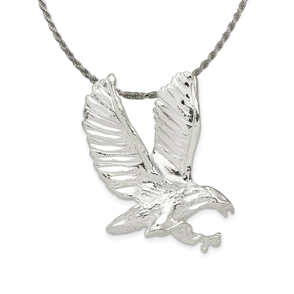 • As a symbolic symbol, meaningful totem, or just because you love eagles this polished pendant is a soaring delight. It features a two-dimensional diamond-cut design fashioned from sterling silver that is approximately 25mm (1 Inch) in width by 38mm (1 1/2 Inch) in length. Includes a flexible and strong diamond cut rope chain. This stunning chain is 2.25mm in width, 26 inches in length and features a sturdy lobster claw clasp. The chain is crafted in Italy.