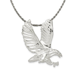 As a symbolic symbol, meaningful totem, or just because you love eagles this polished pendant is a soaring delight. It features a two-dimensional diamond-cut design fashioned from sterling silver that is approximately 25mm (1 Inch) in width by 38mm (1 1/2 Inch) in length. Includes a flexible and strong diamond cut rope chain. This stunning chain is 2.25mm in width, 18 inches in length and features a sturdy lobster claw clasp. The chain is crafted in Italy.