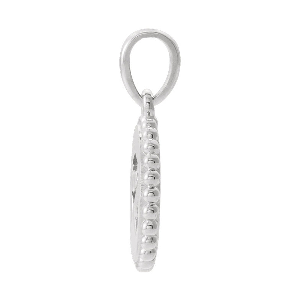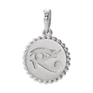 The Eye of Horus or Wadjet is an ancient Egyptian symbol of protection, royal power, and good health. This small disc pendant crafted in sterling silver features a carved design with a beaded edge. The approximate pendant size is 12mm (7/16 inch) in width by 20mm (3/4 inch) in length with the bail. The chain passage dimensions of the bail is 4 x 3mm. This item does not include a chain.