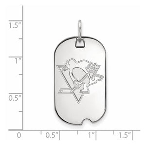 It is time to celebrate your favorite team, the Pittsburgh Penguins! This NHL small dog tag pendant created from rhodium-plated sterling silver is officially licensed by the Pittsburgh Penguins and crafted in the USA. The approximate size is 18mm (11/16 inch) in width by 36mm (1 3/8 inch) in length with the bail. This item does not include a chain.