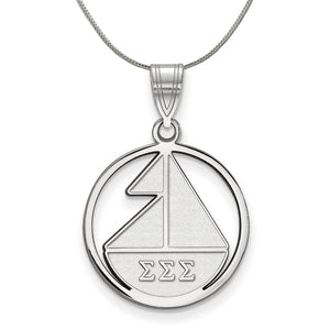 Show your greek life spirit with this Sigma Sigma Sigma Sorority pendant necklace. It is crafted with rhodium plated sterling silver and without the bail is 19mm in height and 18mm in width (0.75 in x 0.71 in). With the bail, the measurements are 25mm in height and 18mm in width. We are a certified LogoArt retailer and this authentic item is licensed by the Sigma Sigma Sigma Sorority and Greek Life. This pendant necklace is made the USA. Includes a 24 Inch, 1.25mm sterling silver franco chain.