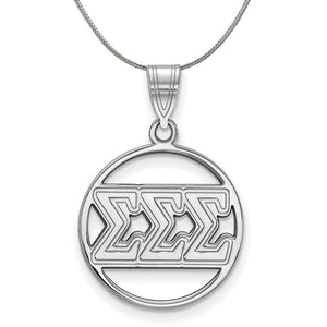 Show your greek life spirit with this Sigma Sigma Sigma Sorority pendant necklace. It is crafted with rhodium plated sterling silver and without the bail is 19mm in height and 18mm in width (0.75 in x 0.71 in). With the bail, the measurements are 25mm in height and 18mm in width. We are a certified LogoArt retailer and this authentic item is licensed by the Sigma Sigma Sigma Sorority and Greek Life. This pendant necklace is made the USA. Includes a 20 Inch, 1.25mm sterling silver franco chain.
