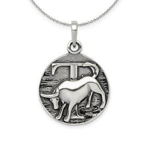 • Taurus, the Bull. The head and horns of the Bull are headstrong and unyielding, yet patient and loving. This 19mm (3/4 Inch) antiqued sterling silver disc features a textured raised relief design with the word Taurus inscribed on the back and dangles from a tapered bail that will accommodate up to a 4mm width chain. Includes a 20 Inch, 1.25mm sterling silver cable chain with a lobster clasp closure.