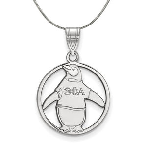 Show your greek life spirit with this Theta Phi Alpha Sorority pendant necklace. It is crafted with rhodium plated sterling silver and without the bail is 19mm in height and 18mm in width (0.75 in x 0.71 in). With the bail, the measurements are 25mm in height and 18mm in width. We are a certified LogoArt retailer and this authentic item is licensed by the Theta Phi Alpha Sorority and Greek Life. This pendant necklace is made the USA. Includes a 24 Inch, 1.25mm sterling silver franco chain.