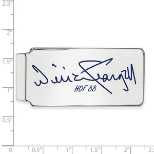 It is time to celebrate your favorite Hall of Fame baseball player, Willie Stargell! We are a certified retailer and this authentic signature money clip is officially licensed. It features a fold over design with a brushed finish that is created from rhodium plated sterling silver with navy blue epoxy. Epoxy colors may vary slightly. The color on your screen may also not reflect actual color due to variations in monitors and browsers. The approximate size is 24mm (15/16 inch) in width by 53mm (2 inches) in length. Made in the U.S.A.