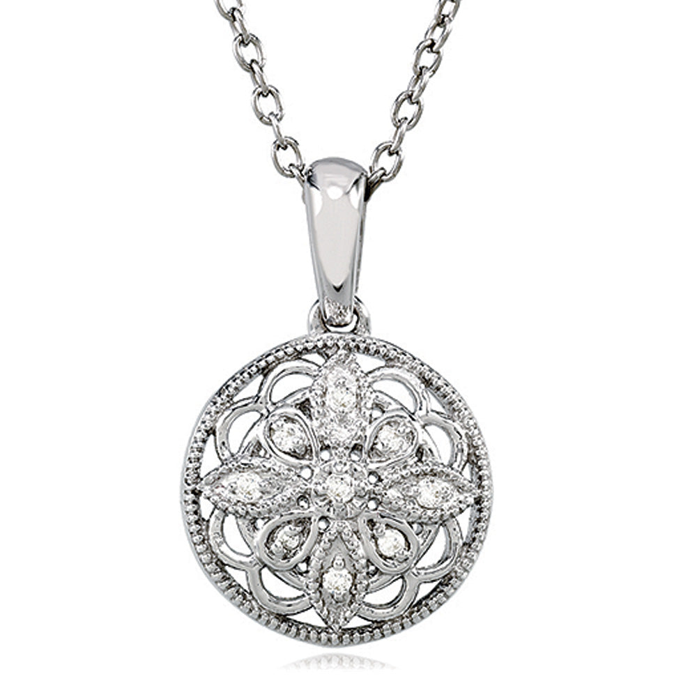 This vintage-inspired sterling silver design has an old fashioned elegance that never goes out of style. The 15mm circle blossom features an open motif infused with nine white diamonds and finished with milgrain detailing. It includes a sterling silver cable chain finished with a spring ring clasp. Each round cut diamond is I2 in clarity and G-H in color. Total diamond weight is .05 of a carat.