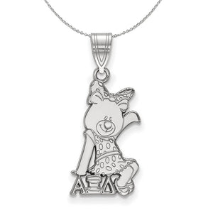Show your greek life spirit with this Alpha Xi Delta Sorority pendant necklace. It is crafted with rhodium plated sterling silver and without the bail is 21mm in height and 12mm in width (0.83 in x 0.47 in). With the bail, the measurements are 27mm in height and 12mm in width. We are a certified LogoArt retailer and this authentic item is licensed by the Alpha Xi Delta Sorority and Greek Life. This pendant necklace is made the USA. Includes a 24 Inch, 1.25mm cable chain.