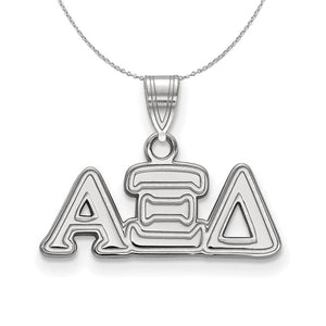 Show your greek life spirit with this Alpha Xi Delta Sorority pendant necklace. It is crafted with rhodium plated sterling silver and without the bail is 10mm in height and 21mm in width (0.39 in x 0.83 in). With the bail, the measurements are 15mm in height and 21mm in width. We are a certified LogoArt retailer and this authentic item is licensed by the Alpha Xi Delta Sorority and Greek Life. This pendant necklace is made the USA. Includes a 20 Inch, 1.25mm cable chain.