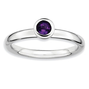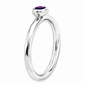 Amethyst, February's birthstone is known as the stone of the mind, bringing calmness and clarity. This 2.5mm band fashioned from rhodium plated sterling silver is bezel set in a low profile mounting with a 4mm genuine round gemstone that will stand out and make a statement. Guaranteed to fit together perfectly with all of the mix and match Stackable Expressions rings. Gemstone treatment: traditional heated process.