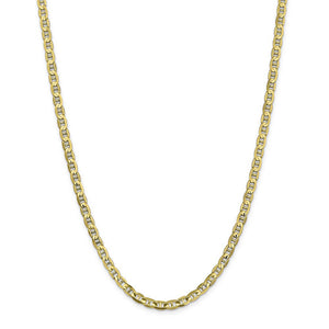 • This polished anchor or mariner chain made of 10k yellow gold features a solid concave design that mimics the cable used to anchor boats with a vertical bar in the middle of each link. The 4.5mm width. 22-inch length makes a beautiful necklace for both men or women and is perfect paired with your favorite pendant or other chains for a layered look. Closes with a reliable lobster claw clasp.