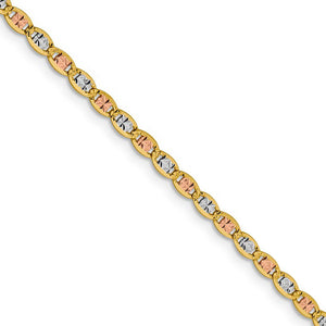 Displaying a contemporary design with pave-cut oval links that provide added dimension and sparkle, this fancy tri-color anchor chain with its solid link construction of polished 14k yellow gold with rose and white rhodium plating will give any outfit a glamorous touch. Measuring 2.75mm in width by 18-inches in length and closes with a lobster claw clasp.
