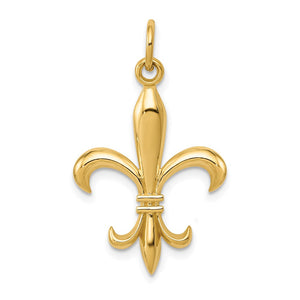 Tie the meaning to the moment with a classic or unusual pendant that makes it personal, thoughtful, or meaningful. This fleur-de-lis charm crafted in 14k yellow gold features a polished 2D design with an open back. The approximate size is 18mm (11/16 inch) in width by 28mm (1 1/8 inch) in length with the jump ring. This item does not include a chain.