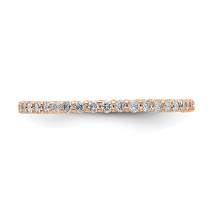 • Classic style featuring shared-prong white diamonds set in 14k rose gold. The 34 natural diamonds are 1.5mm round, I1 in clarity, G-H in color and the total diamond weight is 1/2 carat. This standard fit eternity band is approximately 1.5mm in width and the thickness is less than 2mm.