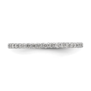 • Classic style featuring shared-prong white diamonds set in rhodium-plated 14k white gold. The 33 natural diamonds are 1.5mm round, I1 in clarity, G-H in color and the total diamond weight is 1/2 carat. This standard fit eternity band is approximately 1.5mm in width and the thickness is less than 2mm.