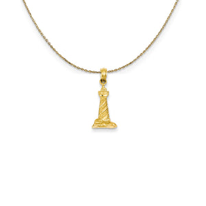 Featured in this 3-dimensional pendant is Cape Hatteras Lighthouse, which is located on Hatteras Island, North Carolina. It enjoys the distinction of being the tallest lighthouse in America as well as one of the most recognized in the world thanks to its pattern of black and white candy cane stripes. Designed from polished 14k yellow gold, it measures approximately 10mm wide at the base by 23mm long, which includes the tapered bail. Includes a 16 inch long, 0.9mm wide, solid 14k yellow gold cable chain with a spring ring clasp.
