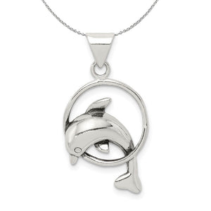 A dolphin inside a circle symbolizes the never-ending cycle of life as well as the playful nature of these intelligent marine mammals. This sterling silver pendant features a two-dimensional open back design with an antiqued finish and is approximately 15mm (9/16 inch) in width by 27mm (1 1/16 inch) in length, which includes the tapered bail. Includes a 1.25mm, 16 inch sterling silver cable chain.