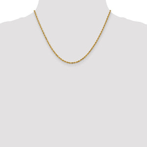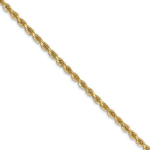 Spiraling rope chains made of 14k yellow gold enhanced with diamond-cuts are extremely popular because they offer a classic design with maximum shine. Flexible and strong, this solid link lightweight necklace chain measures 2.5mm in width by 20-inches in length and closes with a classic lobster-claw clasp.